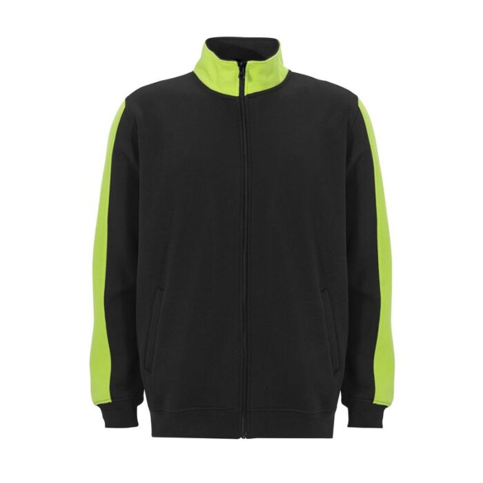 Tvåfärgad fullzipsweatshirt med fickor. Kontrastfärg på ärm, krage och axelparti bak. Normal passform, borstad insida.